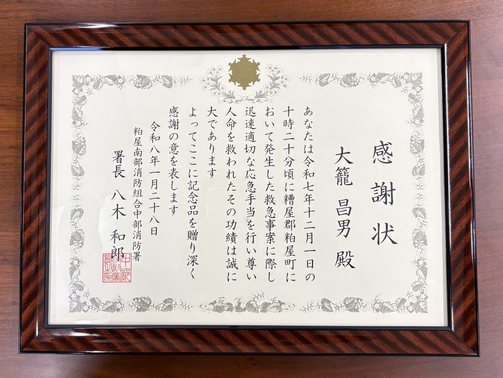 当社従業員が人命救助で表彰されました 2026年2月4日 アズテックコンサルタンツ お知らせ この度、測量調査部の大籠さんが糟屋南部消防組合中部消防署より人名救助に対する感謝状を授与されました。 昨年12月1日、救急事案に際し適切な応急対応を行いました。 その冷静な判断と行動が救命につながったとして、今回の表彰となりました。 当社は、社員一人ひとりの思いやりと行動力を大切にしています。 今回の表彰を励みに、地域社会の安全に貢献できる企業を目指してまいります。 アズテックコンサルタンツ株式会社, 人命救助, 社会貢献